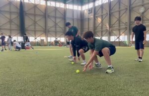 姿勢を低くしてボールを手で転がしながら進むトレーニングです。地味ですが多くの部員が一番きついと口を揃えて言っていました。