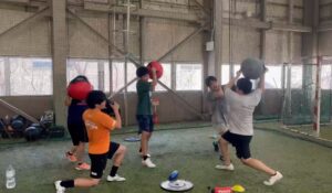 5~10キロの重りを振るトレーニングです。全身を使うのでなかなか疲れます。